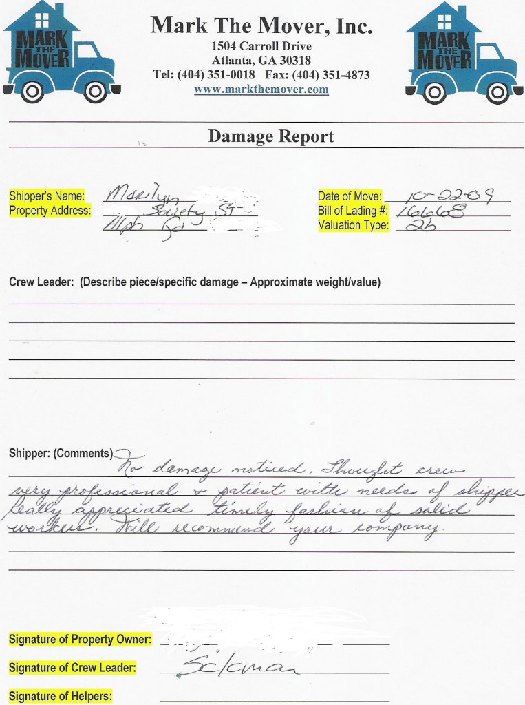No damage noticed. Thought crew was very professional and patient with needs of shipper! Really appreciated timely fashion of solid workers. Will recommend your company.